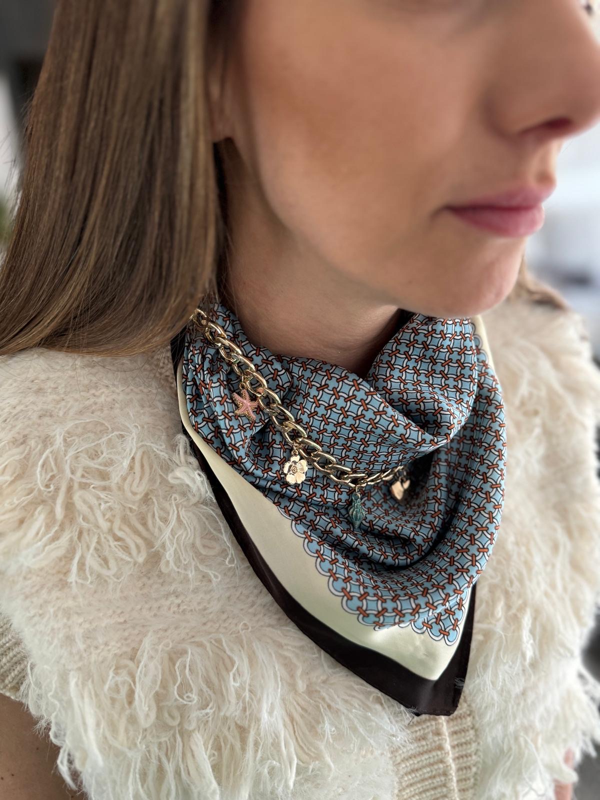 Wyjątkowe połączenie apaszki i biżuterii. Satynowa apaszka zestawiona z ozdobnym złotym łańcuchem i zawieszkami tworzy gotowy element stylizacji — wystarczy jeden dodatek, aby całość wyglądała modowo i efektownie.