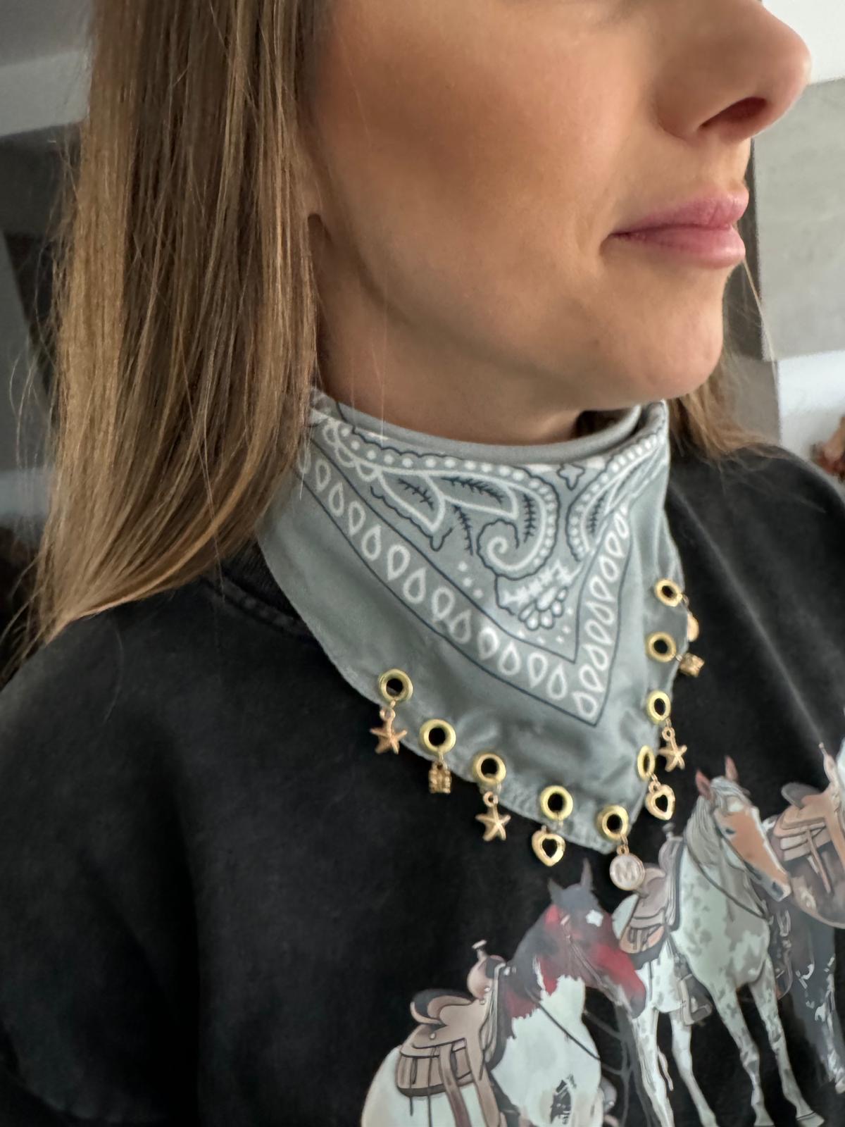 Styl boho w nowoczesnej wersji. Delikatna apaszka ozdobiona złotymi kółeczkami i zawieszkami tworzy wyjątkowy dodatek inspirowany stylem western i festival fashion.