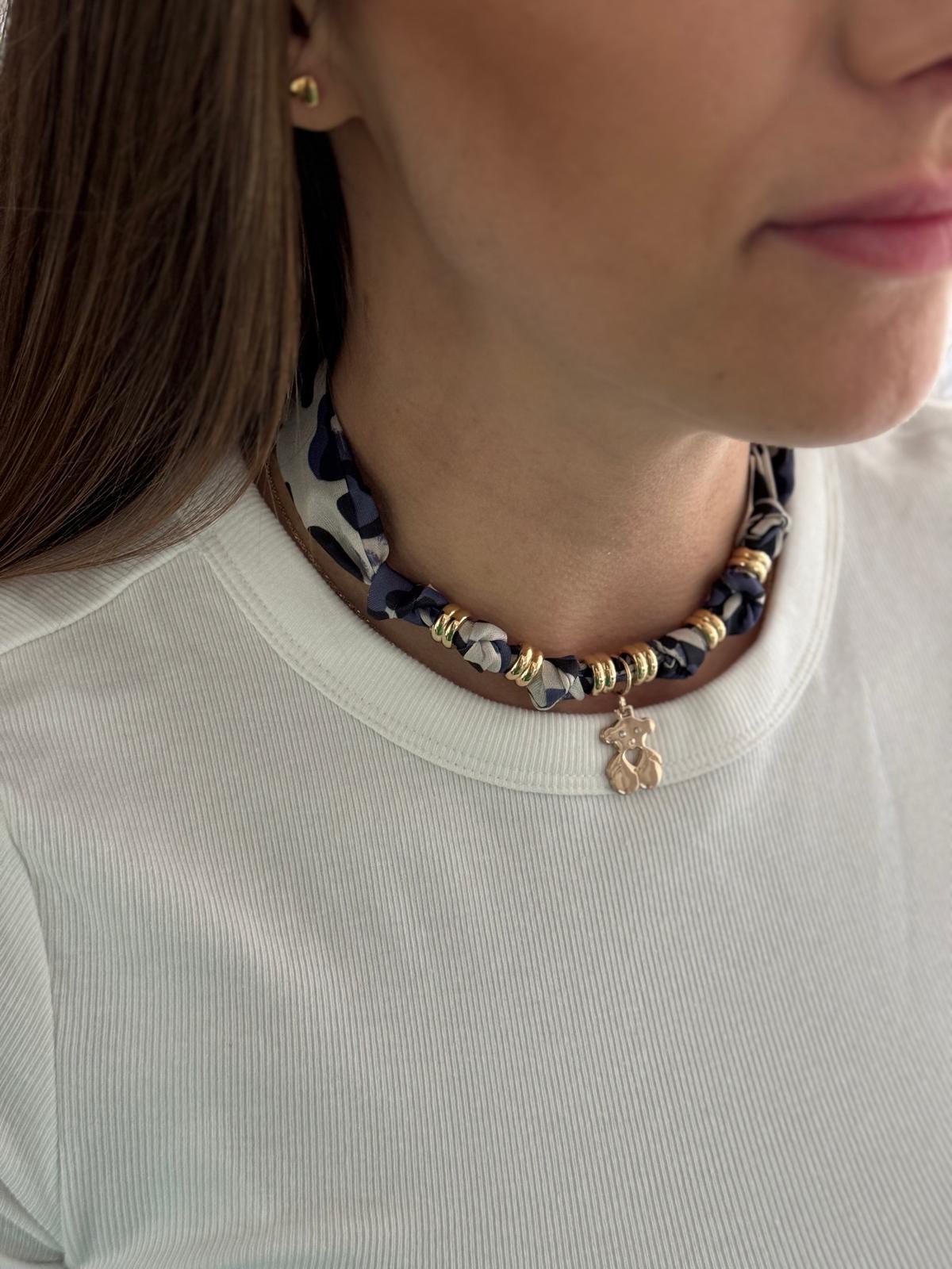 Delikatny, kobiecy i absolutnie wyjątkowy — choker wykonany z miękkiej, satynowej apaszki połączonej ze złotymi elementami biżuteryjnymi i subtelną zawieszką misia.