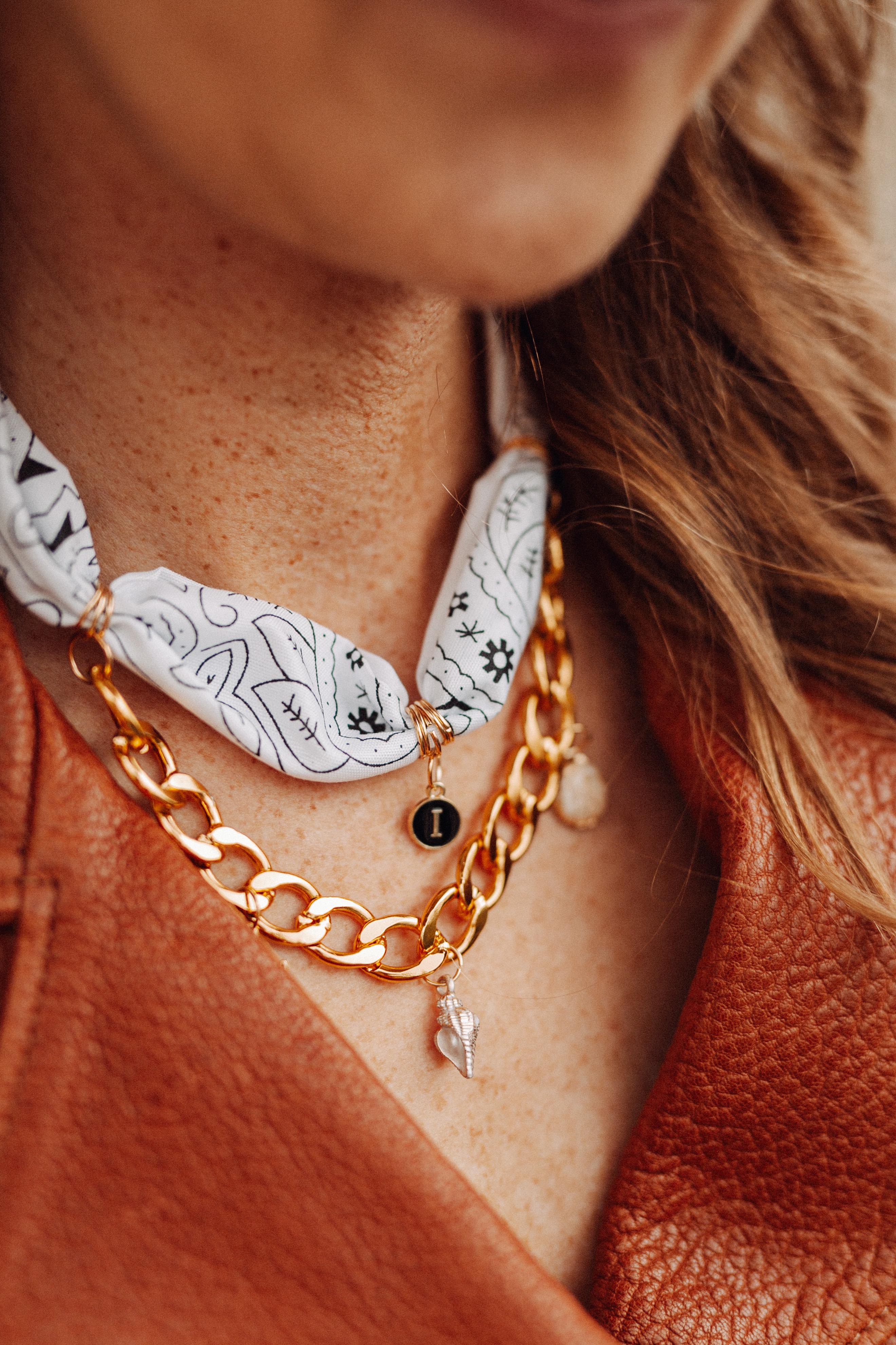 Wyjątkowy naszyjnik Golden Boho Charm to połączenie luzu stylu boho z nutą elegancji. Delikatna biała bandanka z czarnym, artystycznym wzorem została spleciona ze złotym, masywnym łańcuchem, tworząc niepowtarzalny duet.