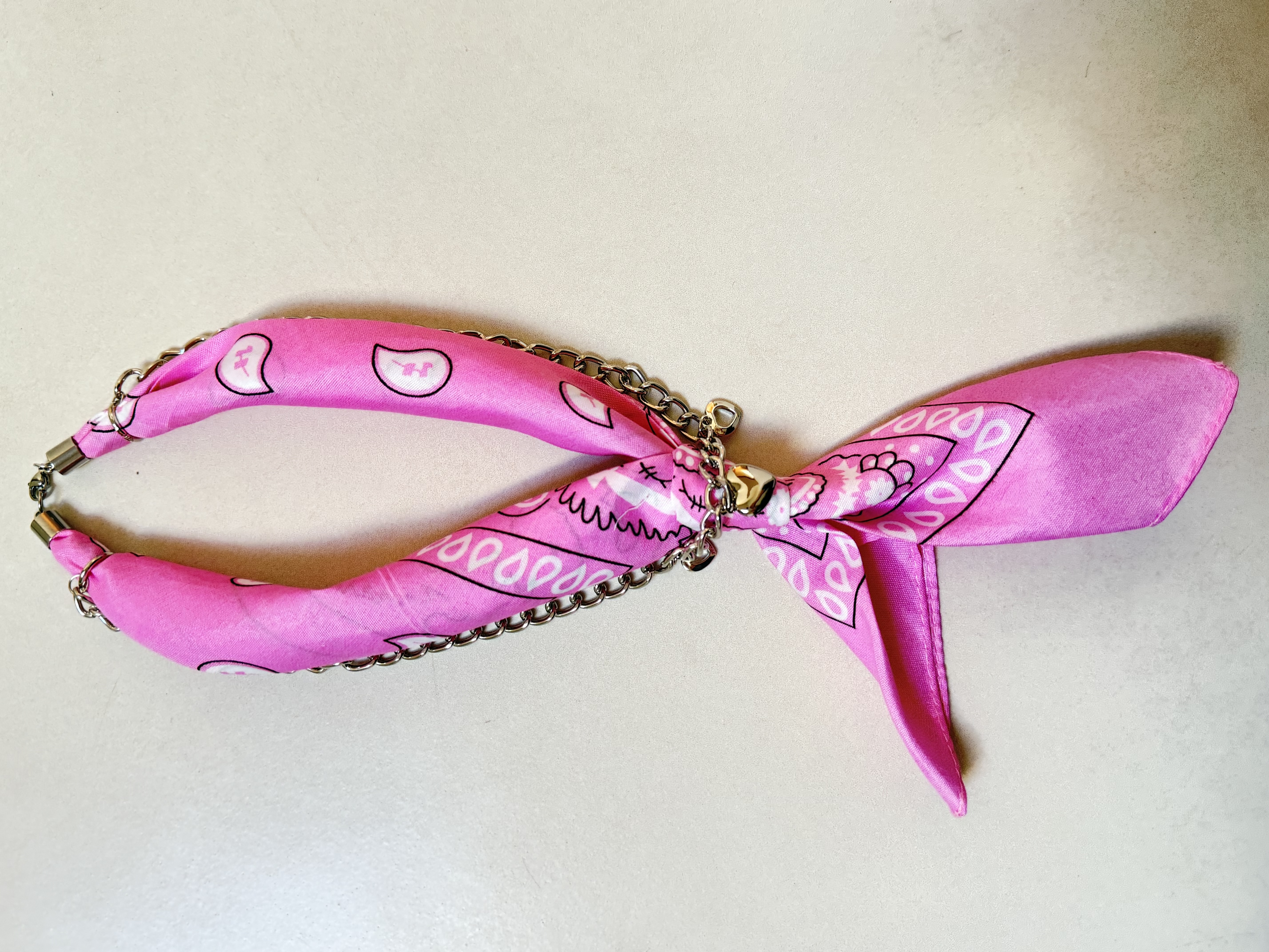 Wyjątkowy naszyjnik z bandany w intensywnym odcieniu różu połączony ze złotym łańcuchem i subtelnymi zawieszkami w kształcie serca. Ten modny dodatek łączy w sobie styl boho, dziewczęcą lekkość i biżuteryjny charakter.