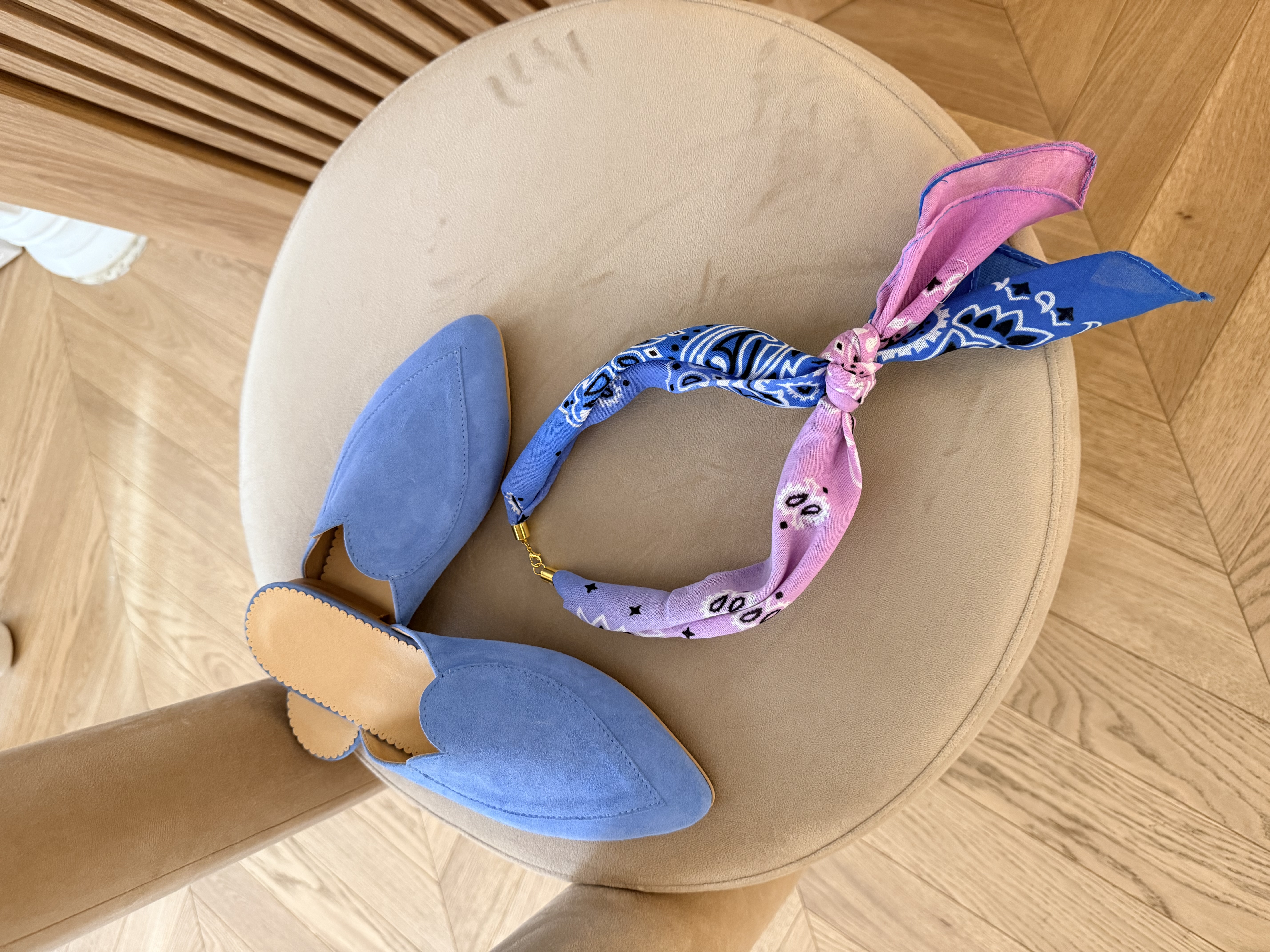 Stylowa chusta z bandanki w pastelowych odcieniach różu i błękitu, która pięknie podkreśla każdą stylizację. Delikatny materiał i klasyczny wzór inspirowany bandaną nadają jej lekkości i kobiecego charakteru.