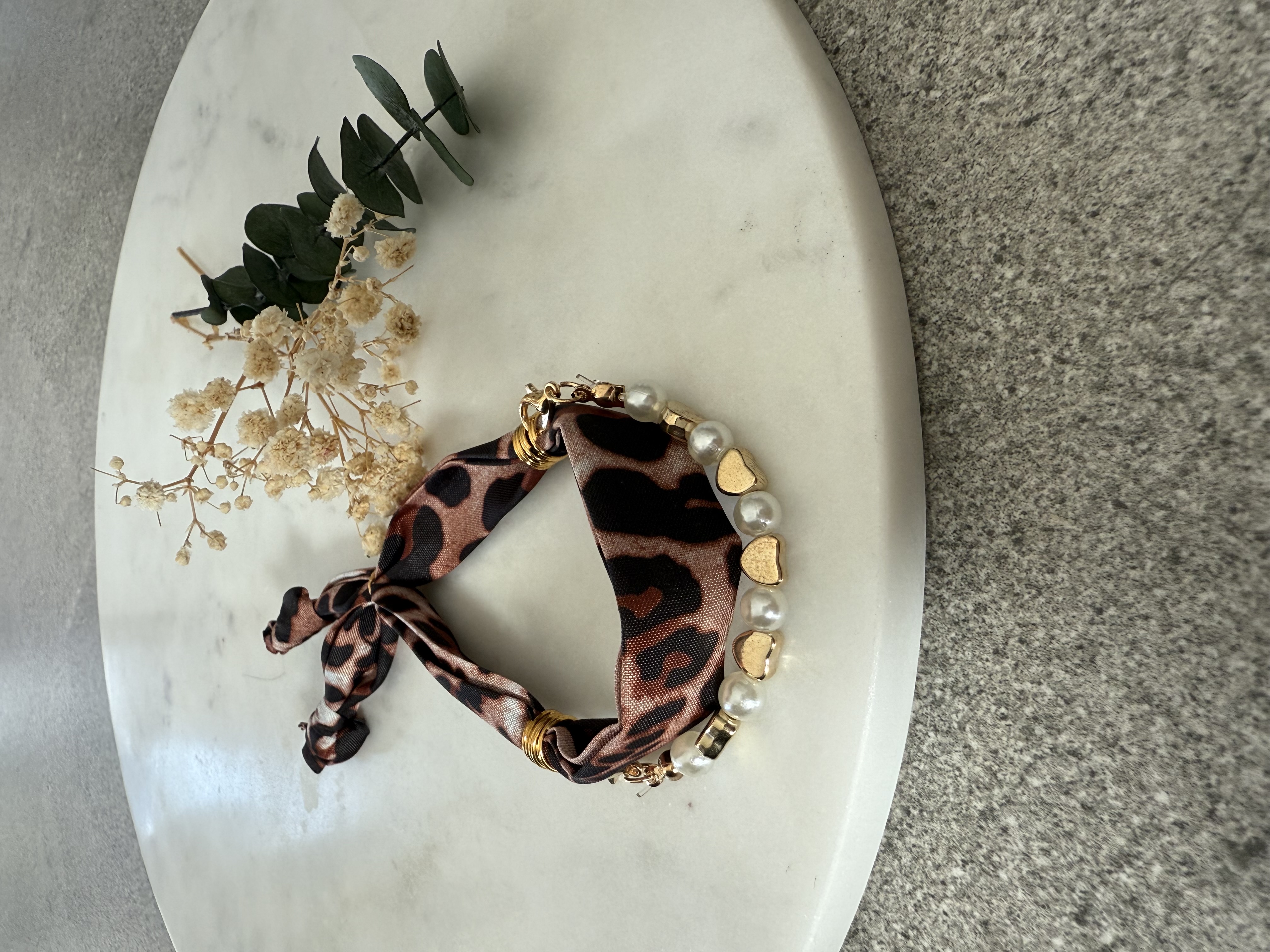 Miękka, satynowa tkanina w panterkowy wzór otula nadgarstek, a połyskujące perły i złote serca dodają jej nuty elegancji i kobiecości.