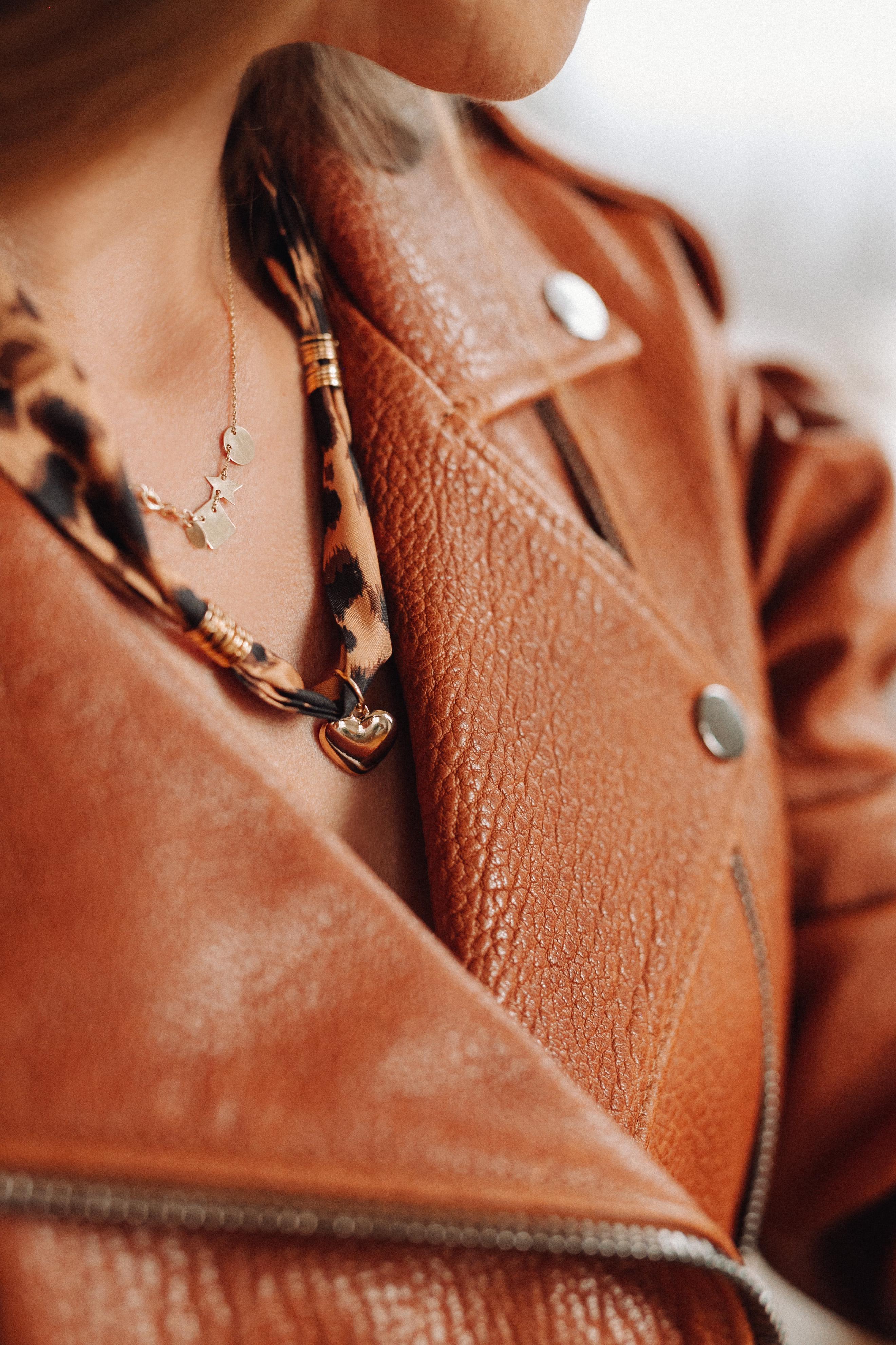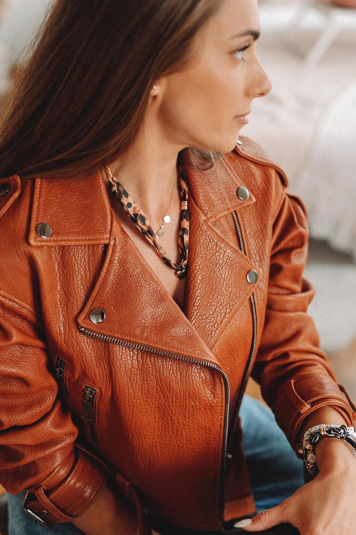 Wykonany z miękkiej, jedwabistej tkaniny w wzór panterki, ozdobiony złotymi akcentami i zawieszką w kształcie serca, które symbolizuje siłę, pasję i wolność.